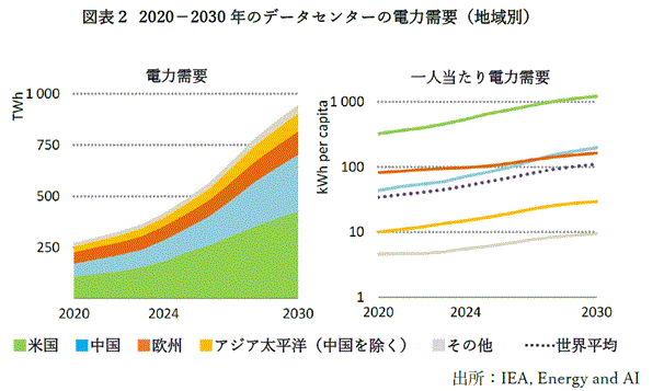 2030年のデータセンターの世界の電力消費量は、2024年の2倍増の945TWhとなり、2030年の世界全体の電力消費量の約3%弱を占めると推測されている。また、データセンターの電力消費量は年間約15%増加し、他のすべての産業セクターの電力消費量の増加率の4倍以上と推測されている。データセンターの電力消費量の増加は中国と米国で顕著であり、2030年の世界全体の増加分の約80%を占めている。各国の状況は以下の通り(図表2参照)。