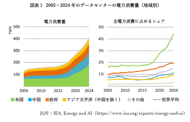 同報告書によれば、2024年の世界の電力消費量は約415TWh、データセンターの電力消費は過去5年間で年間12%増加し、世界の電力消費量の1.5%を占めている。また、データセンターによる世界の電力消費量の約85%は、米国、欧州、中国で占められている。各国の状況は以下の通り(図表1参照)。